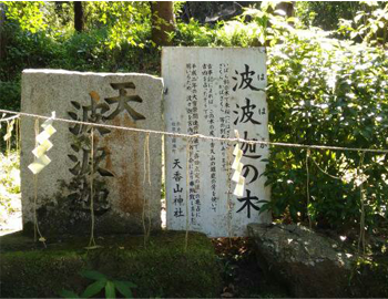 神日本磐余彦天皇(かんやまといわれひこのすめらみこと-神武天皇)の東征軍が賊軍に負けているとき、「祈い(うけい)」をして寝ると、夢のなかで天神が「天香具山の社中の土で祭器を作って天神地祇(てんじんちぎ-天つ神と国つ神)を祭り呪詛(じゅそ-のろい)すれば、敵は自ら平伏する」との教えのままに、すると「高皇産霊尊(たかみむすひのみこと)」という神さまのパワーで敵軍を絶滅でき、その後、連戦連勝で橿原で即位したそうな。
