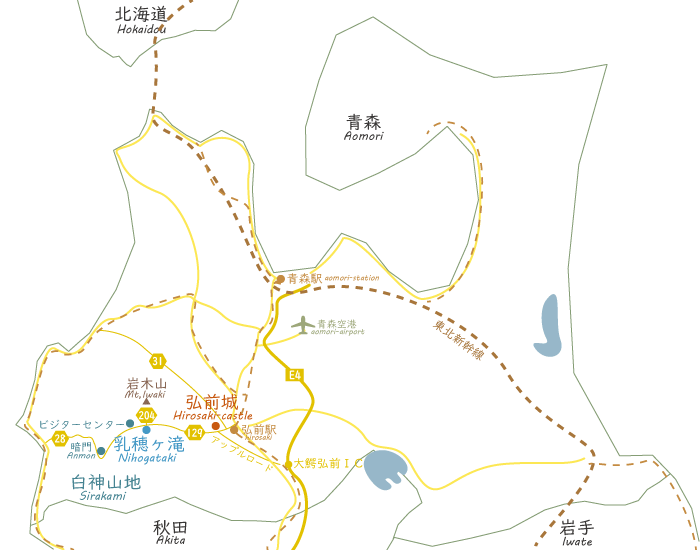 大鰐弘前インター(東北自動車道)→アップルロード 約60分→白神山地ビジターセンター(6/1~10/30)