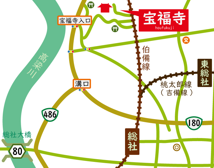 東総社駅より備北バス・地頭から岡山天満屋線で10分(※本数少ない)