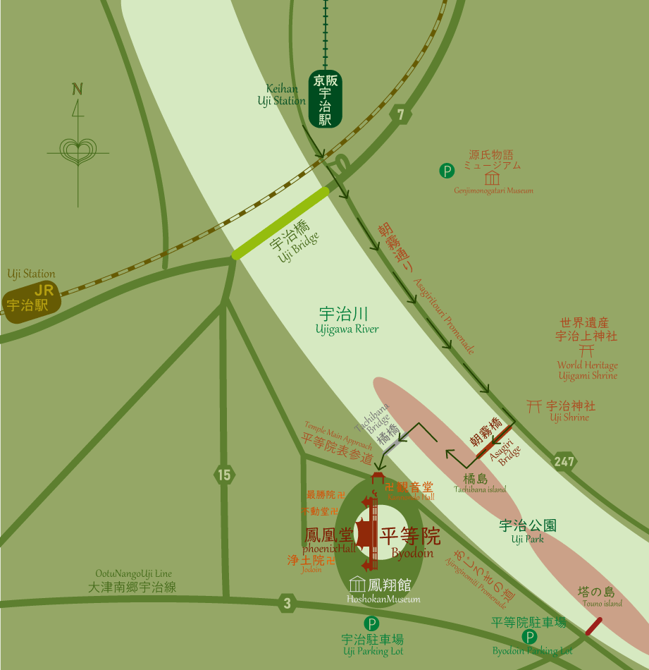 - JR奈良駅―JR奈良線(みやこ路快速)31分→宇治駅―徒歩10分→平等院