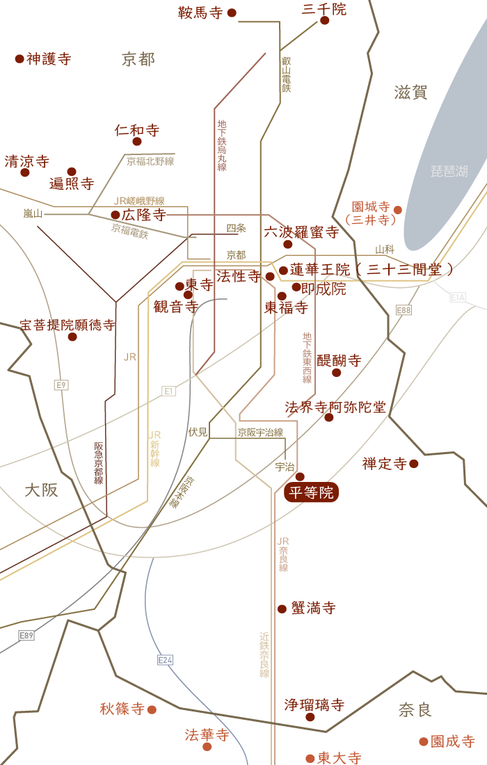 - JR奈良駅―JR奈良線(みやこ路快速)31分→宇治駅―徒歩10分→平等院