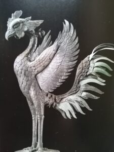 風切羽(かぜきりばね)と尾羽は一枚一枚を銅で鋳造しており、自在に変化をつけている。