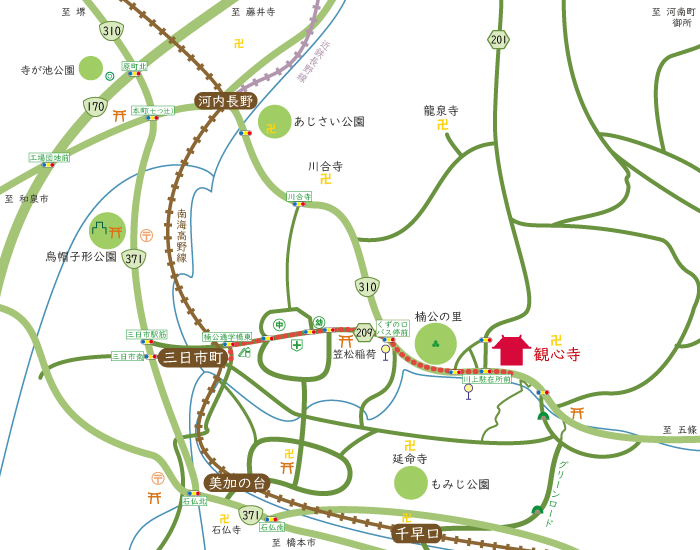 南海高野線、三日市駅を降り、道路を約2キロ歩いて45分程を少しずつ山を登って行く道のりでした。