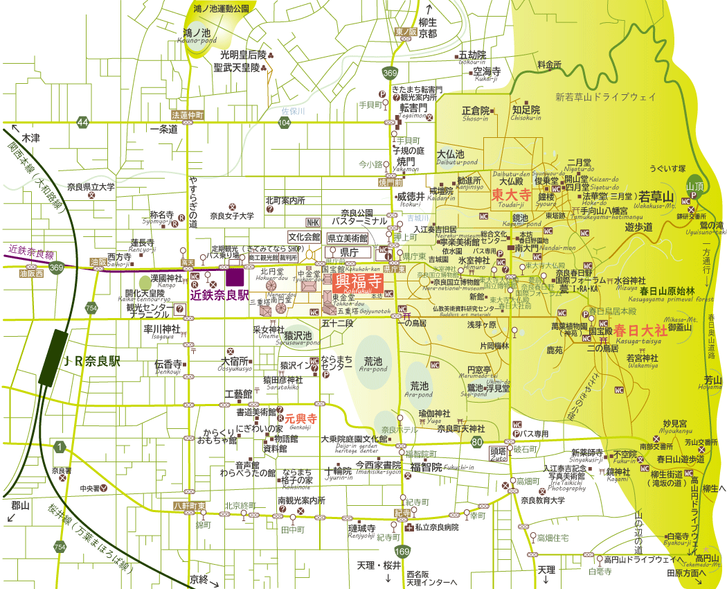 新大阪駅 大阪駅 →大和路快速(約55分)→ JR奈良駅 → バス約7分 徒歩15分