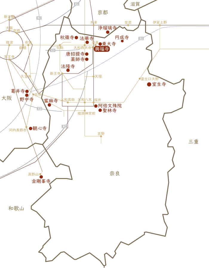 東京駅 → 東海道新幹線(約2時間30分) → 京都駅 → みやこ路快速(約44分) → JR奈良駅 → バス約7分 徒歩15分