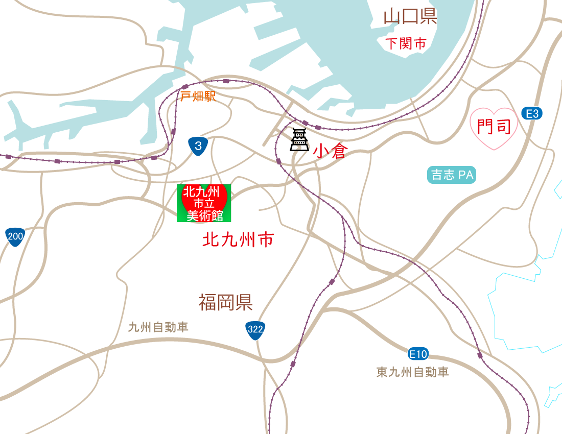 「戸畑駅」から7M番(砂津行き)に乗車、「北九州市立美術館」で下車(所要25分)など 1時間に1本程