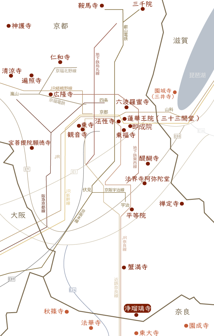 平安時代作の九体阿弥陀如来像とそれを祀る九体阿弥陀如堂(本堂)、四天王像、三重塔など南山城きっての国宝を有する浄瑠璃寺