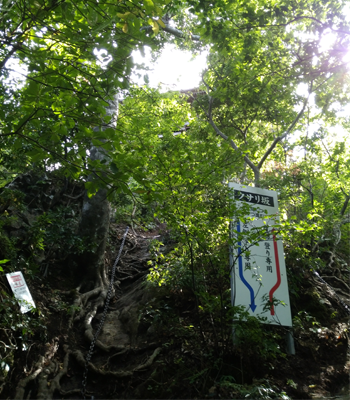 鎖(くさり)や葛(かずら)の根を、両手でつかんで絶壁を登るので、スカートは入山許可されません。