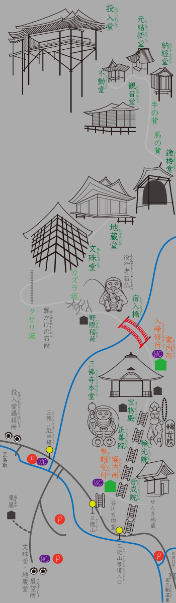 役行者〔(えんのぎょうじゃ)7~8世紀に奈良を中心に活動した修験道(しゅげんどう)の開祖〕が、投げた蓮(はす)の花びらが舞い落ちた神仏ゆかりのある一つが三徳山で、修験道の行場(ぎょうば)として開いたそうな。
