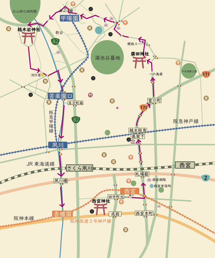 廣田神社から越木岩神社へのアップダウンの約1時間の道のりは、むずかしい迷い道だった。