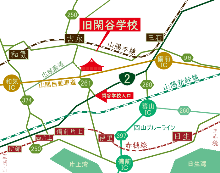 (国道2号線を経由して、「閑谷学校入口」交差点から5km北に入る)
