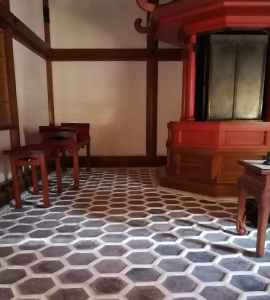 講堂は、入母屋造り(いりもやづくり)しころ葺き(ぶき)の大屋根と