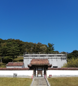 屋根は備前焼(びぜんやき)の本瓦葺き(ほんかわらぶき)で赤い、