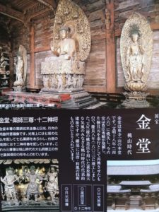 大きな薬師如来(やくしにょらい)を中心に、右手に日光菩薩(にっこうぼさつ)左手に月光菩薩(がっこうぼさつ)。
